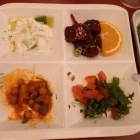 Schlotzig-leichtknusprige Hähnchenabschnitte in süßlich-leichtscharfer Sauce mit knackigem Gemüse und Kartoffeln sowie aromatischem, feinen Reis mit Granatapfelkernen dekoriert. Schön mit Erdnüssen und Weintrauben etc. verfeinert. Insgesamt harmonisch aber mir etwas zu mild/flach. Dennoch zufriedenstellend, auch wenn da noch wenige Karkassenteile im/am Huhn zu finden waren.