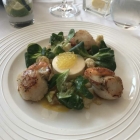 Jakobsmuscheln und Hummercocktail eröffneten unsere beiden Menüs. Uns fiel gleich beim ersten Bissen die hohe Produktqualität der exakt zubereiteten Meeresbewohner auf. Die Muscheln waren im Inneren noch schön glasig und lagen neben einer angebratenen Blutwurst, deren deftiges Aroma zusammen mit dem Apfelnachhall vom Calvadosschaum und der knackigen Frische des Staudenselleries zu einer kleinen Geschmacksexplosion im Mund führte. Die leicht süßlich schmeckenden Hummerstücke punkteten mit saftiger Konsistenz und gingen mit der Cocktail-Sauce eine äußerst leckere Liaison ein.