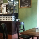 Wir also nach links rein. So stelle ich mir eine Studentenkneipe bzw. ein einfaches Bistro vor. Toll die Theke, ein Hingucker die Apothekerkommode, ansonsten hat man beim Anblick des Mobiliars das Gefühl, selbiges hätte schon viele Partys über- und erlebt. „Deutliche Gebrauchsspuren“ klingt so negativ, trifft es aber und mich hat’s nicht gestört, verströmt der Gastraum doch eine gewisse lässige Gemütlichkeit.
