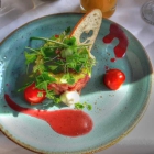 Meine Frau erwählte sich ein wahres Sommergericht als Vorspeise, die Strauchtomaten waren durch das Grillen sehr aromatisch und perfekt mit Knoblauch, Chili und Olivenöl abgeschmeckt. Dazu ein Beutel Burrata, aus dem die Sahne quoll………der Gesichtsausdruck meiner Frau verriet vollste Zufriedenheit.