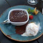 Recht schnell folgten unsere Hauptgerichte. Meine Black-Tiger-Garnelen (28,00) kamen in einer Schmiedepfanne mit voller Stiellänge. Eigentlich gibt es zum Servieren ja solche mit eingerolltem Stiel. Der Ententeller (22,50) meiner Frau war übervoll, so dass meine Frau mutmaßte, das Tier sei in der Soße ertrunken. Naja, wenn die Tische klein sind, müssen die Teller es auch sein. Das Gratin wurde separat geliefert. Man wusste nur nicht, wo man einen Löffel davon auf dem Teller unterbringen sollte. Vor den hohen Temperaturen der Behältnisse wurde gewarnt.
