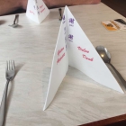Gut , fast alle. Der zweier Tisch ganz hinten im Eck war der einzige mit einer normalen Platte. War halt der beste zum Fotos machen . Eingedeckt sind die Tische mit Besteck und stehenden weißen Servietten mit Aufdruck .