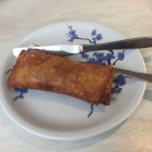 Die Frühlingsrolle war schön knusprig raus gebacken und überhaupt nicht fettig. Sie knusperte so richtig beim schneiden und essen. Gefüllt war sie mit krümeligen Hackfleisch, Weißkraut, Sojasprossen, Gelberüben, Bambussprossen und Zwiebeln. Es war alles in feine Streifen geschnitten und schön abgeschmeckt. Eine sehr dezente schärfe war auch vorhanden.