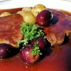 Zum Rehbraten wurde ein sauer angemachter, gemischter Salatteller gereicht. Das Dressing des sorgfältig in dünne Streifen geschnittenen Endiviensalats besaß eine dezente Knoblauchnote und erinnerte mich an die Art des Salatanmachens meiner Oma. Frisch geraspelte Möhren und ein wenig Feldsalat komplettierten die aus knackfrischen Zutaten bestehende Grünbeilage. Der Rehteller selbst bestand aus drei zart geschmorten Fleischinseln, die aus einem dunklen Saucensee empor ragten. Die schön lockeren, homogenen Kartoffelknödel trugen ein Toupet aus Butterbröseln und wurden à part serviert. Die seriös zubereitete, harmonisch abgeschmeckte Wildsauce zeugte von langem Einköcheln und einer kräftigen Jus-Basis.