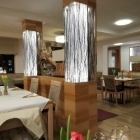 Dennoch fühlten wir uns in der mit viel hellem Holz ausgestatteten Gaststube nicht unwohl. Die Theke war in unmittelbarer Reichweite und erleichterte die Kontaktaufnahme mit den freundlichen Servierdamen. Mein Blick fiel auf die raumteilenden Leuchtsäulen in der Mitte des gepflegten Gastrokosmos der Roths, die mir schon früher als gelungene Interieurelemente ins Auge sprangen.