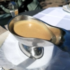 Natürlich ließ mich meine Mutter einen anständigen Happen davon kosten. Ihr war die Fleischportion dann doch des Guten zu viel. Besonders die zu den in der Pfanne geschmorten Zwiebeln angegossene Bratensoße ließ mich dabei in nostalgischen Geschmackserinnerungen schwelgen. So und nicht anders muss eine handwerklich tadellos zubereitete Soße zum Fleisch schmecken. Dass sie aus einer grundsoliden Jus gezogen wurde und ohne Pülverchen auskam, verstand sich da von selbst.