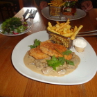 Männe nahm das Champignon-Rahmschnitzel mit Pommes und Salat, zu 19,90 Euro.