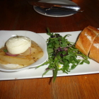 Na ja. Besonders toll,war es nicht. Die Birnenscheiben waren warmund darauf lag 1 roterZwiebelring,auf dem wiederum warmer Ziegenkäse lag,welcher mit etwas Thymian garniert war.Also gratiniert,war der Käse nicht ! Einfach nur warm.
