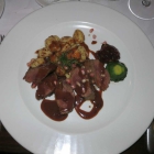 Wie gewünscht medium rare gegartes Hirschrückenfilet in dezent mit Kakao aromatisierter Granatapfeljus. Die eher langweiligen Gnocchi mit Johannisbrotbröseln gepimped. Überflüssig der halbierte, kalte Patisson mit Preiselbeergelee. Licht und Schatten zu gleichen Teilen auf dem Teller, die Hauptkomponente mit ihrem schönem haut goût aber über jeden Zweifel erhaben.