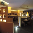 Noch ein paar Worte zur Einrichtung des Culinariums. Sie ist modern, aber nicht ungemütlich. Viel indirektes Licht, das die Weinflaschen als Protagonisten in den Vordergrund stellt, dazu futuristisch anmutende, dimmbare Röhrenleuchten an der Decke sorgen für ein stimmungsvolles Ambiente. Man sitzt auf gut gepolsterten, mit Lederimitat überzogenen Stühlen bzw. Wandbänken. Eingezogene Trennwände wirken raumteilend und schaffen immer wieder gemütliche Nischen. Dadurch lassen sie den großen Gastraum behaglicher wirken. Großformatige, auf Leinwand gezogene Fotos von Kaffeebohnen und Kastanien zieren die pastellgelb gestrichenen Wände. Zweier-Tische sind „über Eck“ eingedeckt. Das erleichtert die Kommunikation und schafft ein engeres Beisammensein am Tisch.
