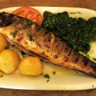 Der Robalo grelhado (gegrillter Wolfsbarsch), ein schöner Portionsfisch mit Grillspuren in einem freundlichen, hellen Schwarz, drei frittierten Kartoffelstücken und etwas Spinat. Vielleicht insgesamt etwas naturbelassen und leicht trocken, zusammen mit der Zitrone und dem Spinat aber durchaus genießbar.