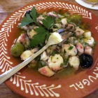 Brot, Aioli und Oliven (3,50) waren unspektakulär, die eingelegte Oliven Standart, wobei die gefärbten (schwarz) nicht so gut wie die Grünen schmeckten. Der Ziegenkäse mit kleiner Salatgarnitur (4,-) äußerst mild, etwas aufgepeppt durch Öl und getrocknete Kräuter. Mein Oktopus in grüner Soße (6,50) zwar zart aber etwas ausgelaugt in sehr essigbetonter Vinaigrette. Das Grün der Soße bestand lediglich in ein Paar Petersilienblättchen, etwas Brot wäre schön, muss man aber wohl extra bestellen. Die sechs Gambas in Knoblauchsauce (9,90) ordentlich mit etwas Salat, für den Geschmack des Kollegen zu wenig Knobi, insgesamt in Ordnung.