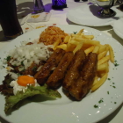 Ich konnte mich mit den vier gegrillten, mit "Hirtenkäse" gefüllten Schweinefiletröllchen nicht so anfreunden. Dafür fehlte es ihnen schlicht an Würze. Der Kuhkäse der Füllung riss da auch nichts raus. Gut die Kombination aus Butterreis und warmer, pikanter Balkansoße, die mich mit ihren reichlichen Gemüsebestandteilen an ein Letscho erinnerte. Gut auch der leichte Kontrast zwischen den doch von der Zubereitung und den Zutaten her ähnlichen roten Soßen. Die kalte Variante aus der Sauciere wartete mit leichter Knoblauchnote auf. Pikant im Sinne von annähernd scharf war keine von beiden, so dass die am Mann getragenen Gewürzgranaten, gefüllt mit Pul Biber und Habanerochilipulver einen Würzeinsatz bekamen.