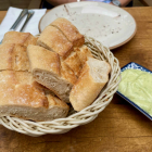 Der junge Mann kommt mit einem Brotkörchen und einem Schälchen. Er serviert uns den Gruß aus der Küche, frisches, warmes Baguette und rúcula alioli, eine Rukola-Aioli-Creme.