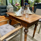 Auf der Terrasse stehen vorwiegend Zweiertische mit blanker Holzplatte auf Metallgestell in kleinen und größeren Abständen, so dass eine größere Personengruppe an nebeneinanderstehenden Zweiertischen Platz finden kann. Die umstehenden Gartenstühle haben geflochtene Sitz- und Rückenflächen, Sitzkissen gibt es auch. Aber auch Omas Tisch findet Verwendung auf der Terrasse, wie das folgende Bild mutmaßen lässt.