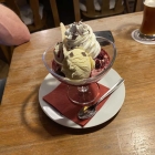 Spotzl geriet beim lesen der Karte in kindheits Erinnerungen . Gab es doch bei ziemlich jeder Geburtstagsfeier Vanilleeis mit heißen Beeren. Und so sollte es heute für ihn sein. Es gab drei Kugeln Vanilleeis. War jetzt nicht das leckere von der Eisdiele , aber es passte schon für diesen Eisbecher und schmeckte auch. . Es gab aufgeschlagene Sahne mit dazu die nicht süß war und darüber etwas Schokostreusel. Die Eiswaffel mit der Vanillecreme lies uns auch wieder zurück schweifen, wie damals vor ….Jahren. Unsere Finger reichen nicht mehr zum zählen und die Zehen dazu auch nicht . Es waren gemischte Beeren in der Soße vorhanden, sie war auch nicht zu sauer, leicht süßlich und auch noch schön warm als das Eis an den Tisch kam. Unsere Worte – wie damals, es schmeckt, gerne wieder.