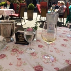 Zweiter Grund für die Einkehr war der liebevoll gestaltete und dekorierte Außenbereich. Spätestens als Madame die Rosendekorstofftischtücher entdeckte, war die Entscheidung gefallen. Ein Blick in die ausgehängte Karte ließ mich zustimmend nicken. Wir fanden einen kleinen Tisch direkt an der Außenmauer des Gasthauses, für meine Frau in der Sonne, für meine Wikingersommersprossen die andere Hälfte der Bank im Schatten (ich hatte schon etwas Sonnenbrand).