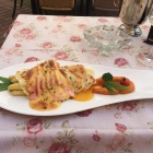 Letztendlich blieben wir in der Spargelkarte hängen und dort bei einer Portion Stangenspargel in einem Crêpes mit Sauce Hollandaise überbacken, dazu hausmarinierter Lachs und ein Süßkartoffelpüree. Serviert wurde uns ein sehr appetitanregender Teller in stilisierter Fischform. Der Spargel selber perfekt gegart, noch mit ausreichend Bis, eine fast orange Sauce Hollandaise dazu, sehr buttrig. Ein Höhepunkt der marinierte Lachs, der auf den Punkt glasig serviert wurde, obwohl der mit der Sauce Hollandaise auf dem Crêpes gratiniert wurde. Ich nehme an, er wurde roh auf den Crêpes angerichtet und dann unter der Sauce mit überbacken, das war perfekt! Interessant dazu das Süßkartoffelpüree, nicht gerade eine typisch münsterländische Beilage zum Spargel, hier aber sehr spannend mit seiner Süße zur gratinierten Sauce Hollandaise. Mit einem Wort, lecker!
