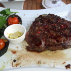 Bei der Essenbestellung waren wir wieder unsicher. Ich hatte von Open Table in Erinnerung, dass die Steaks eine gewisse Serienausstattung mitbringen. Aus den Speisekarten auf dem Tisch war dies nicht zu entnehmen. Meine Frau wollte australisches Black Angus Filet medium, Salat und Farm-Kartoffeln (Country Style) und erfuhr dann, dass eine kleiner Salat zum Essen gehöre, ebenso Ofenkartoffel. Ich nahm das australische Rib Eye (medium rare) mit 400 g und auch die Country Potatoes. Die Preise sind eher hoch. Da ich nur eine nichtssagende Rechnung habe, versuche ich, mich zu erinnern. Das Filet mit 200g lag bei 38.-, mein Rib Eye bei 44.-. Die Fleischbestellung läuft sehr differenziert ab. Auch Zwischengarstufen sind möglich, z.B. medium-well done.