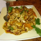 Für meine Liebste wird es das Knusperhuhn auf gebratenem Gemüse mit Erdnuss-Soße auf heißer Eisenplatte serviert und ein Schälchen Reis dazu (13,90€). Die Erdnuss-Soße hat ein gutes Aroma und ist nicht zu erdig/ aufdringlich. Das Gemüse ist kurz angebraten und knackig. Das Fleisch ist noch saftig. Für unseren Geschmack ist die Panade zu dick und zu viel geraten – da hilft nur fizzeliges Auspacken aus dem Brotmantel.