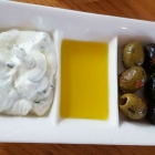 Dazu ein Kräuterfrischkäse, Olivenöl, schwarze und grüne Oliven.