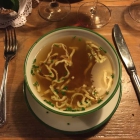 Zu meiner Vorspeise: die Flädlesuppe mit Schnittlauch und Gemüsebrunoise (EUR 7,10), absolut klasse gewürzt mit dünnen Flädestreifen.