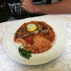 Wir hatten zwei dunkle Weizen zu je 4,20 € , Steirischer Bauernteller- Schweinefilet mit gedünsteten Zwiebeln ( scharf) und Djuvec Reis für 15,50 € und Pola Pola – Raznjic und Cevapcici mit Djuvec Reis, Pommes Frites, Zwiebeln und Ajavar für 14,50 €