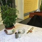 Auf dem Tisch gibt es viele Tischdecken übereinander zum Teil in Häckeloptik. Ja der Oma würde es gefallen. In verschiedenen nicht passenden Übertöpfen befinden sich frische Blumenstöcke. Zusätzlich gibt es noch Salz-und Pfefferstreuer und einen Aschenbecher.