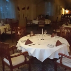 Schön eingedeckte Tische mit kleiner Mitteldecke, Grünpflanze, Windlicht und Stoffservietten. Innen wurde noch aufwändiger eingedeckt. Auch der Toilettenbereich piccobello, Frotteehandtücher etc.!