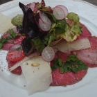 Die Küche grüßte mit Tomatenhälften und Mozarellakugeln in Basilikumpesto. Dazu aufgeschnittenes frisches Brot und Butter. Ich fand das bei dem heißen Wetter durch die gekühlten Zutaten eine erfrischende Überraschung die schmeckte.