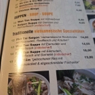 Bedauerlicherweise habe ich, das muss ich gestehen, meinem Herzensschatz im jugendlichen Überschwang seine Vorspeise, die ihm zugedachten beiden Nem (Frühlingsrollen mit Salat und süßer Fischsoße) weggefressen; allerdings nicht ganz, den Salat und die süße Fischsoße hatte ich unberührt gelassen. Die eigentlich mir als Vorspeise zugedachten Goi Cuon (Reisnudeln mit Garnelen und Gemüse in Reispapier eingerollt) stießen nicht auf Gegenliebe; die vier Garnelen wurden herausgepickt, der Rest blieb liegen. Auch mit ihrem Hauptgericht, das von mir nicht angetastet worden war, hatte meine Holde aus ihrer Sicht leider nicht das Gelbe vom Ei erwischt. Der gebratene Tintenfisch und das Gemüse nebst Reis waren zwar reichlich vorhanden, allerdings hätte der Vorstellung nach der Kopffüssler in Gestalt von Tuben und Ärmchen auf dem Teller bzw, in der Schale liegen sollen, was nicht der Fall war. Vielmehr trat er in Form der erbenfalls bekannten rispenartigen weisslichen Gebilde auf; geschmacklich in Ordnung, aber insgesamt doch etwas enttäuschend.