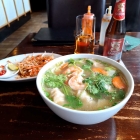 In Sachen Vorspeise blieb ich einmal mehr an den sehr schmackhaften "Há Cao & Xiu Mai" Zu EUR 5,00 hängen. Und einmal mehr schaffte ich es auch diesmal nicht, als Hauptgericht das "Bami Goreng à la Vietnamese" zu testen. Stattessen fiel mir ein, dass ich hier schon ewig nicht mehr die ausgezeichnete "Pho Tái Saigon" für EUR 14,00 gegessen hatte. Bei der Bestellung der Speisen, speziell der Pho, wollte die Chefin wissen: "Original oder ohne Koriander?" Selbstverständlich nimmt Mr.Simba das Original, selbst auf die Gefahr hin, dass es in der Küche mit dem Koriander ein bisschen übertrieben wird und die Pho dann ein wenig nach Seife schmeckt. Ich darf vorausschicken, dass das nicht der Fall war.