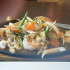 Große Ereignisse werfen ihre Schatten voraus; ehe die große Schüssel mit der Suppe kam, brachte die Wirtin eine Platte mit Bambussprossen, einer halben Limette, den gehackten kleinen roten Chili-Teufelchen sowie zwei Spritzflaschen; die eine enthielt Hoisin-Soße und die andere Nuoc Mam Cham, die legendäre vietnamesische Fischsoße.Mit diesen Beilagen kann bzw. soll der Gast im Bedarfsfall seiner Suppe Flügel verleihen. Es empfiehlt sich aber, diese zuvor zu kosten, um nicht des Guten zuviel zu tun. Ich habe in meine Suppenschüssel nur Bambussprossen, einige wenige Spritzer von der Nuoc Mam Cham und nur einen Hauch von den gehackten kleinen Teufelchen gegeben; damit war die Suppe als Suppe für mich perfekt. Reichlich Eiernudeln in Spaghettiform waren in der aromatische Brühe zu finden, dazu Lauch, dünne Möhrenscheiben, Koriander und Silberzwiebelchen. Weiterhin fette Wan Tan-Taschen, gefüllt soweit ich es erschmecken konnte mit gehacktem Huhn und gehackten kleinen Garnelen, sowie Hühnerfleischwürfel und Garnelen der Kategorie Black Tiger 8/12. Einziger Kritikpunkt meinerseits:Fünf Wan Tan-Taschen anstelle der vorgefundenen sieben Stück hätten mir völlig gereicht; dafür hätte ich im Tausch gerne eine Black Tiger mehr gehabt, die vorhandenen zwei Exemplare waren mir nämlich zu wenig.