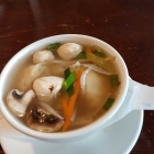 Getränke kommen hier immer sehr flott, während es mit den Speisen schon etwas länger dauert; wer schon mal einen Blick in die wirklich kleine Küche, in der der Chef als Einzelkämpfer vor sich hin werkelt, hat werfen können, weiss, warum. Irgendwann kam dann aber doch meine "Wan Tan Suppe": Auf dem Boden der Suppentasse zwei wirklich fette mit Hühnerfleisch gefüllte "bezipfelte Kissen" (ind der Hauptgerichtsversion sind es sechs davon) und darüber eine schmackhafte Brühe, in der Championköpfe, Bambussprossen und à la brunoise geschnittene Wurzelgemüse schwimmen. Auf der Karte steht dieses Gericht mit dem Hinweis "mittelscharf"; um die Suppe in diesen Zustand zu bringen, muss ich persönlich allerdings schon ein wenig mit Pfeffer und Salz nachhelfen. Ich war mit dieser Suppe, die ich kürzlich als Vorspeise und Wochen bzw. Monate zuvor als Hauptgericht gehabt hatte, jedenfalls wieder sehr zufrieden, Als Hauptgericht ist sie übrigens selbst für stärkere Esser durchaus sättigend.