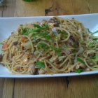 Frisches, scharf angebratenes Gemüse (wie oben) in Spaghetti-Nudeln mit Ei und Rinderhack.