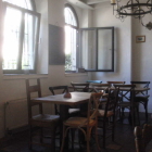 Tische und Stühle sind aus dunklem Holz. Die Platte zeigt eine Maserung und wirkt durch die Schattierungen darauf recht rustikal. Nur eine kleine Vase mit einer frischen Blume dient als weiterer Blickfang.