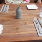 Die Tische sind blank. Es gibt Papierservietten.