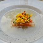 Viel besser dann die weiße Tomaten“consomme“. Ob hier wirklich im klassischen Sinne geklärt wurde, lasse ich mal offen - die sehr helle Farbe spricht sogar dafür. Mindestens aber sorgfältig durchs Tuch passiert und wohl noch reduziert. So oder so, die am Tisch angegossene, heiße Tomatenessenz sprach eine deutliche Paradeiser-Sprache. Was noch durch die Einlage einer intensiven, getrockneten Tomate verstärkt wurde, die anfangs in einem Gelee von Tomatenwasser eingeschlossen war. Das löste sich in der Hitze auf und reduzierte gleichzeitig die Temperatur. Auch hier ließ man Blumen sprechen und tatsächlich bereicherten die Hornveilchen-Blüten mit ihrer kräuterigen Note das Gericht.