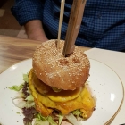 Das Fleisch gut gewürzt und perfekt, noch leicht rosa, gebraten. Der Seam-Bun frisch aufgebacken, Tomate, Zwiebelringe, Gewürzgurke. Der Käse schön gratiniert und auch die Saucen passten gut.