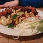 Und auch das Essen konnte wieder nicht komplett überzeugen. Die Vorspeisenplatte ( Fingerfood Platte Thai Break - € 12,90 ) für zwei Personen irgendwie in Ordnung, gut die Sate Spieße und die Erdnusssoße, ein Teil wie Frühlingsrollen und Tintenfischringe doch eher TK und nicht aus der angekündigten Frischeküche. Mein Haupgericht Gaeng Kiew Wan Nuea ( gebratenes Rindfleisch pikant gegart in Kokosmilch, grünem Curry, Thai Basilikum, Bohnen, Auberginen und Paprika - € 11,90 ) wie angekündigt schön scharf mit dünnen, zarten Rindfleischstücken und bissfestem Gemüse. Absolut in Ordnung, allerdings erinnerte mich das Gericht von der Soßenmenge her mehr an einen Eintopf. Das Gericht meiner Frau, Ped Pad Med Ma Muang ( Knusprige Ente mit Cashew Nüssen, Zwiebeln, Knoblauch, Paprika, Lauchzwiebeln und kräftiger Sojasoße - € 14,90 ), fiel dagegen wegen der Ente deutlich ab. Knusprig war die Ente sicher nicht, einige Stücke zwar schon etwas trocken aber noch essbar, bei der Hälfte die Haut aber noch komplett wabbelig-weich und für sie damit nicht essbar.