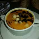 1x Hokaido-Kürbissuppe fein abgerundet mit Honig und Ingwer, seinem Öl und Kernen (4,90€).
