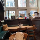 Laut Homepage wurde das Lokal 2014 grundrenoviert. Die ist gelungen, weil die stilbestimmenden Elemente nicht angefasst wurden oder Neues sehr gelungen eingepasst wurde. Es dominieren Holzfarben (dunkle Täfelungen an den Wänden, der Theke und Decke im hinteren Raum, helle blanke Tische und ein rustikal gemaserter Fußboden in Plankenoptik). Man sitzt wandseitig auf grünen Lederbänken. Die beiden ineinandergreifenden Räume machen das Lokal schlauchförmig und die Tische längs der Wände sind schlank gehalten. Für vier Personen ausreichend, für sechs Personen gemäß Bestuhlung unterdimensioniert.