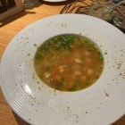 Serviert wurde die Suppe mittelheiß und in ordentlicher (Normal)Portionsgröße. Meiner Mitesserin fiel auf, dass der Rand des Suppentellers bei Lichte besehen rundherum einen unsauberen Eindruck machte; schlecht zu beschreiben, aber frisch gereinigtes weißes Porzellan sieht anders aus. Dito mein Tellerrand. Also ging die Suppe einmal zurück und der Kellner versprach, sie von der Rechnung zu nehmen, was auch geschah. Zu den Suppen gab es ein Körbchen mit ordentlichen Stangenweißbrotscheiben. Eine gute Pfeffermühle und einen Salzstreuer holten wir uns selbst aus dem Regal.