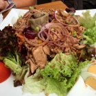 Der Salat ist knackig und frisch, das Baguette ist außen knusprig. Geschmacklich gibt es nichts zu bemängeln. Wir sind schon ganz gut gesättigt, als die Salatplatte leer ist. Sorge um's Sattwerden? Da waren bei mir die Augen größer als der Bauch.