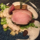 Auf der anderen Seite des Tisches startet man mit Pescaccio vom Färöer Lachs. Diese etwas gewollt kreative Bezeichnung beschreibt letztlich nichts anderes als roh aufgschnittenen Lachs, der mit etwas Holunderblüte und Zitrone mariniert ist. Die Fischqualität ist gut, aber insgesamt bleibt das Gericht sehr mild. Daran ändern auch die Tupfen fermentierten schwarzen Knoblauchs nichts. Kein schlechter Gang, aber leider ohne den ganz besonderen Kick oder eine besondere Würze, die den Fisch nach vorne gehoben hätte.