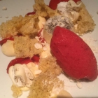 Die Erdbeeren finden sich als Sorbet und mariniert als Salat in einem durchaus klassischen Umfeld, der vor allem von Vanille geprägt ist. Als Sponge, Creme und Panna Cotta wird auch dieses Thema durchdekliniert. Die Kardamombaisers bleiben relativ neutral. Die angekündigte Atsina-Kresse kann ich nicht ausmachen, aber schmecken tut es dennoch gut.