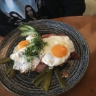 Das Erdinger Frühstück bestand aus zwei großen Scheiben dunklen Brot mit Paar Körnern ,das leicht angeröstet war. Darauf lag angebratener Schinken und darüber zwei Spiegel Eier. Das Brot war sehr lecker, der Schinken gut gebraten, dass Spiegelei mit wachsweichen Dotter. Es gab noch Essig Gurken Streifen dazu. Dekoriert war der Teller mit frischem Sojasprossen, Kräutern und Tomaten. Es war alles schön gewürzt.