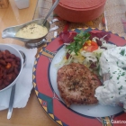 Unter anderem gab es zu Tisch den kleinen Beilagensalat, feurigen Rindfleiscntopf, Rumpsteak, Schweinesteak, Kalbsteak usw. Die Gerichte kann man sich individuell zusammenstellen oder sich fertige Kompositionen kredenzen lassen.