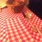 Typisch für derartige Restaurants die rot/weiß karierten Tischdekorationen. Einfach gehalten.