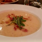 Für das mächtige Stück Terrine waren weich gekochte rote Bete und der überraschend cremige Ziegenfrischkäse fantasievoll geschichtet worden. Das sah schwerer aus als es schmeckte. Zudem überzeugte die fantastische Haselnusskruste mehr als erwartet - wie bestes Nougatkrokant. Sehr gut passend zur Erdigkeit der Knolle, nur der Käse schwächelte geschmacklich etwas. Fast perfekt.